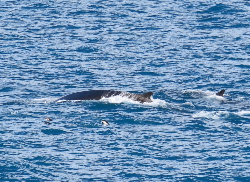I liked this photo because you can see the tiny penguins swimming alongside the blue whales.
