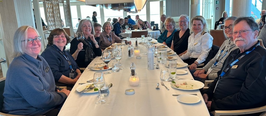 Waiting for the elevator before tonight’s information session, I met Leslie, another solo traveler. Like me, she’s a widow who is comfortable traveling alone. Her cabin will be across the hall from me.