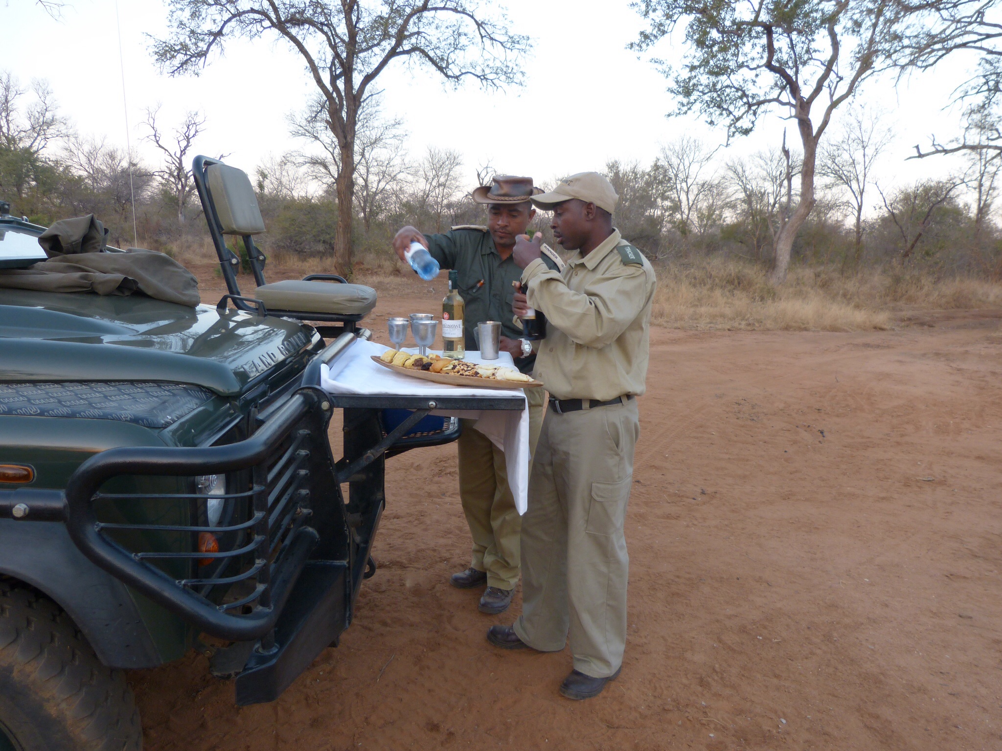 We had our picnics during our two daily game drives: coffee and pastries to tide us over till our huge breakfast, and “sundowners” (beverage of choice–mine was wine) in the afternoon.