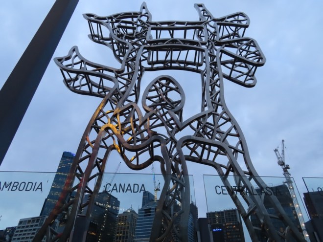 After dinner last night, we walked over what I am calling the Sculpture Bridge. That’s when I discovered the “walls” along the bridge each bore the name of a country, in alphabetical order. I was already up to Canada before I noticed that, but I imagine the first panel bore the name of Afghanistan. The last panel was not Zimbabwe, but was instead “All Other Countries in the World”. Man, those Aussies are smart! They took into account how unpredictable global political entities are!