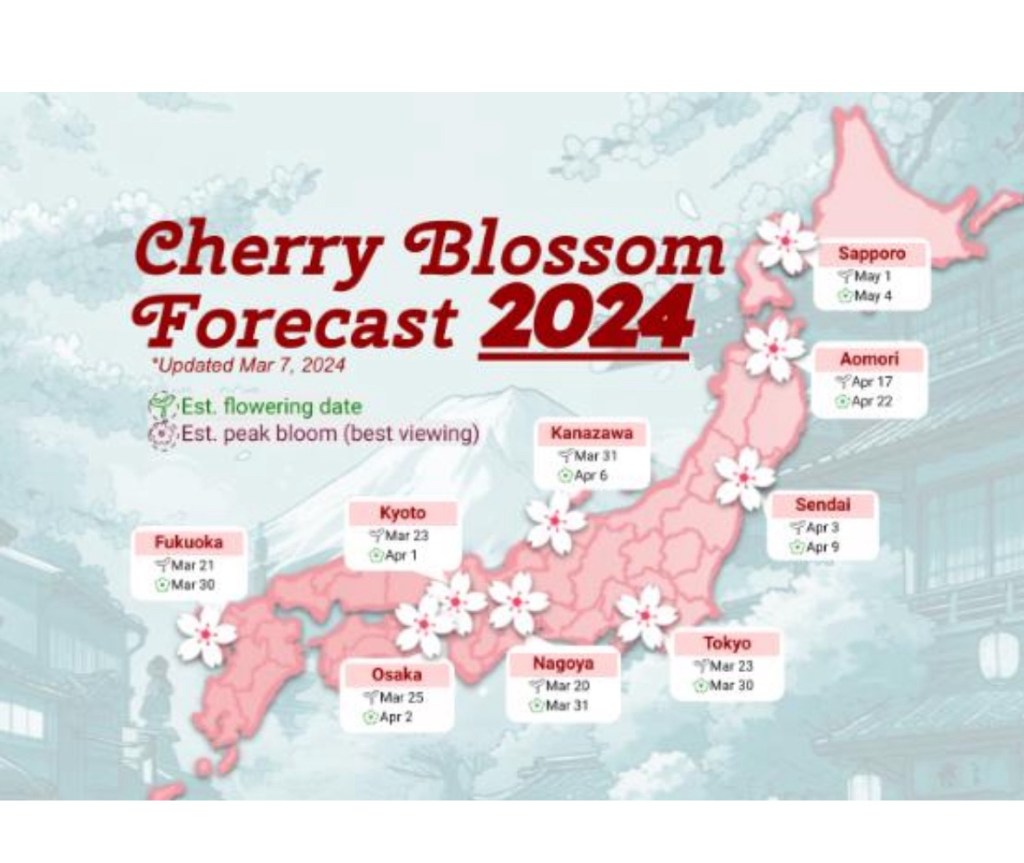 Our wonderful guide, Mori, has been communicating with us already via WhatsApp. He sent us this map, with the good news that we should have a wonderful cherry blossom show in Kyoto.