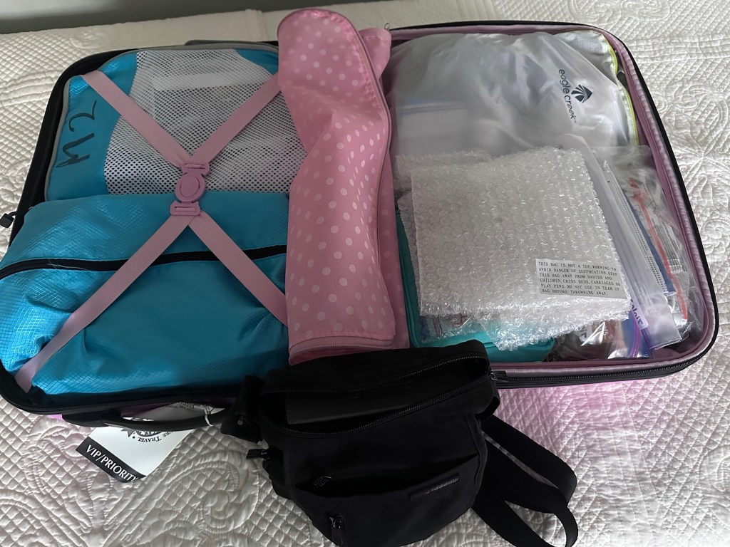 We had been warned to pack lightly, partly because hotel rooms are small by US standards and partly because we need to only take an overnight bag on the bullet train. (Our larger luggage will be transported by van). I was glad to learn that some hotels have laundry facilities on site, so opted to do carry on only, and it looks like this: