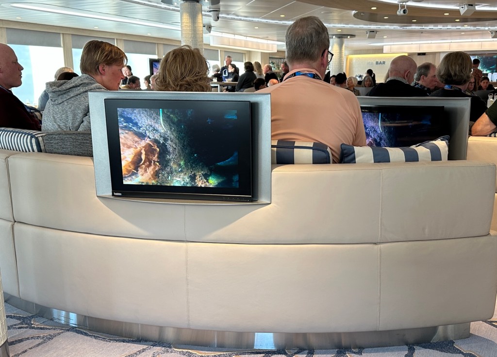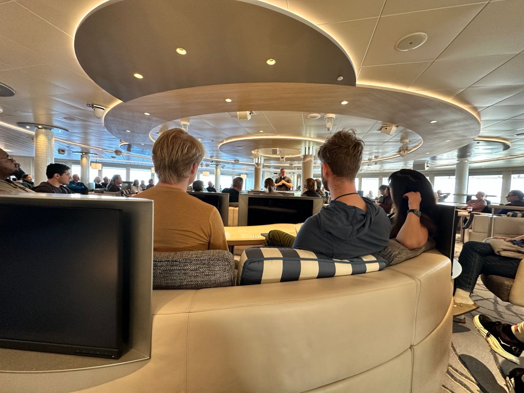 Every evening we gather in the lounge for a recap of the day’s activities. Of course, because the talk is in the lounge, we are a very jolly audience, because we can have whatever beverage we desire, and quantities are not limited.