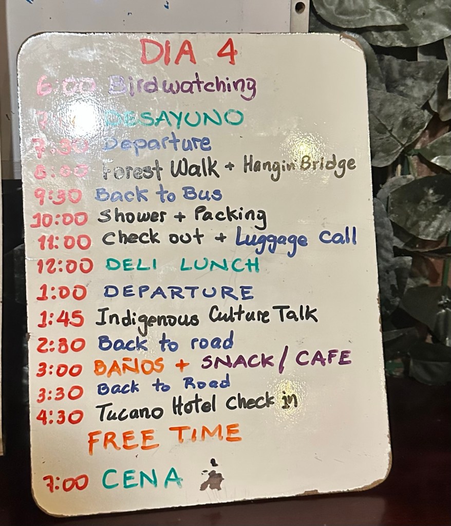 who responded to Edwin’s many personal and pretty hilarious questions about their relationship. The 6 of us going on the post trip to Tortuguero will definitely miss the 7 that will be returning home at the end of the main trip tomorrow.