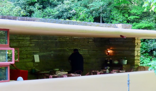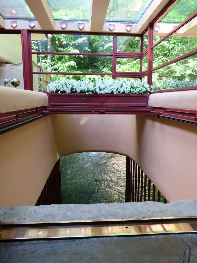 So how was it, you ask? Well, the house was quite fascinating, especially given that it was completed in 1937. As you can see from the photo above, the house was built over a waterfall. When the windows are open, you can definitely HEAR that water falling! Closing the windows successfully shuts out most of the noise…and also the cooling breezes. Fallingwater, you see, is not air conditioned. Did they even HAVE AC back in the late ’30s?