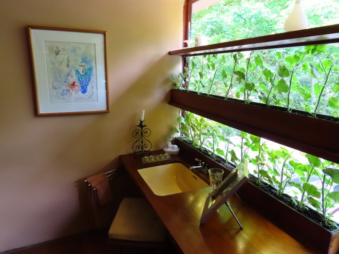 Here’s another example. You are out in the middle of nowhere, so window coverings are not needed, but in the bathroom, why not have planters built into the window to form a natural curtain?