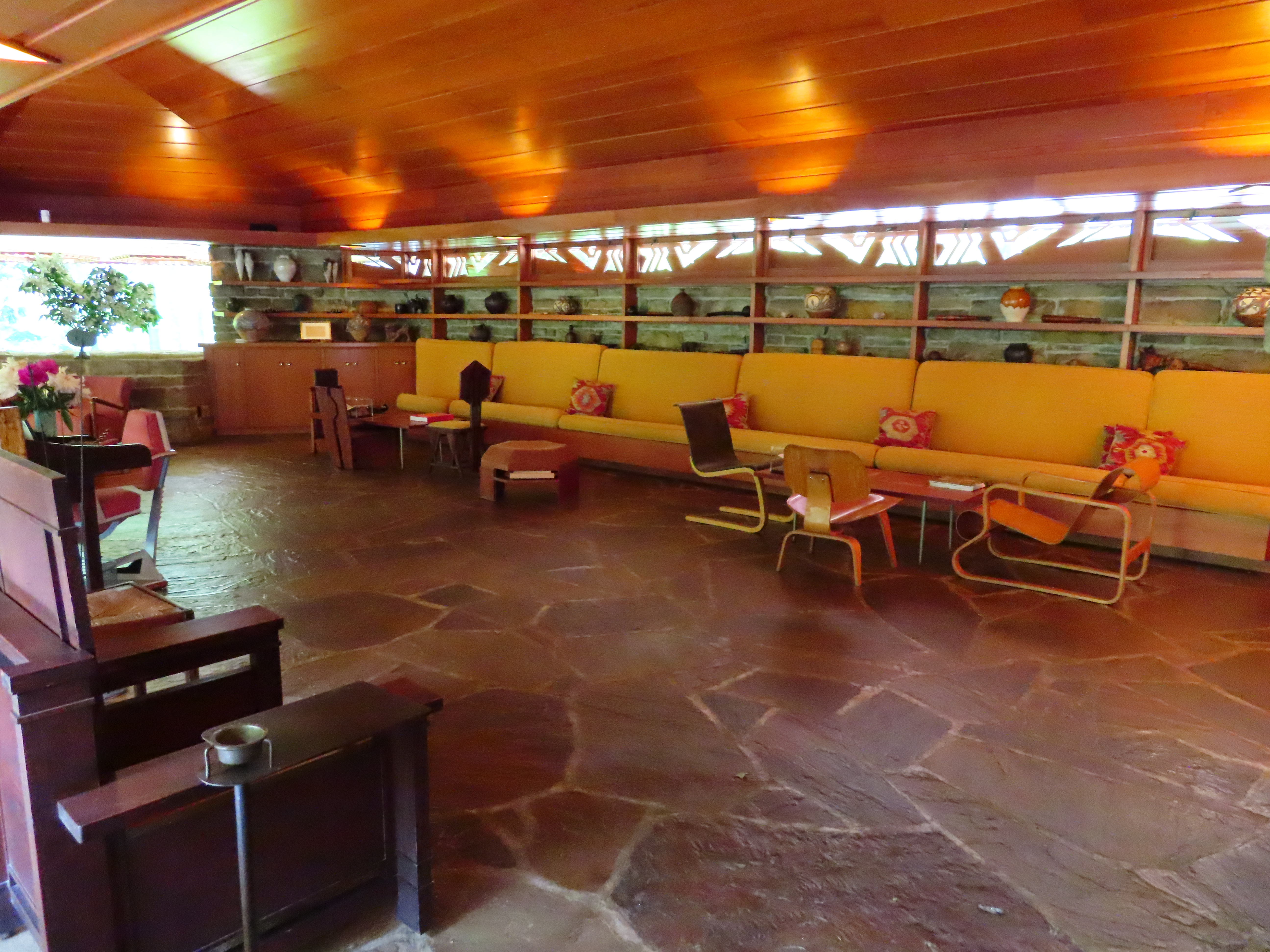 Wright not only designed the building, he also created all the furniture throughout the house. I was surprised to see a king sized bed in the master bedroom. Our guide explained that it was actually two twins pushed together and united by a single headboard and bedspread, something TV in the 1950’s would never have shown. (It isn’t that visually interesting, so I didn’t bother posting a photo of it–everyone knows what a king sized bed looks like.) How surprising that it took about three decades for that great concept to catch on!