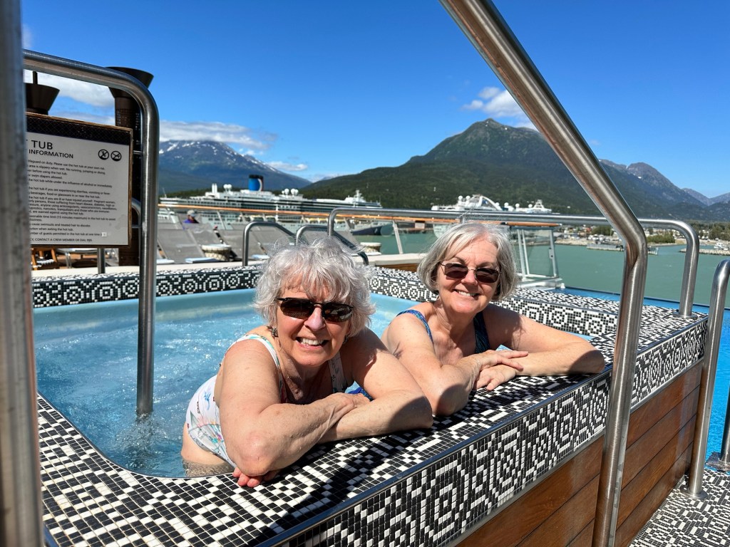 The lure of craft beer, tee shirts, and gold mining memorabilia wasn’t strong enough to keep us from the ship’s outside hot tub. Hard to believe that there are over 900 guests on this cruise. We had the hot tub completely to ourselves.
