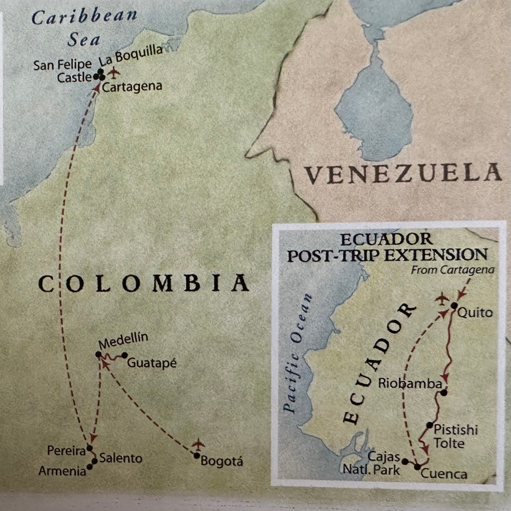 When I learned that Columbia was one of the countries featured on the 2024 Amazing Race, I streamed those two episodes to get a sneak peek at what I might expect. Like the contestants, we will be traveling to Bogota, Medellin, Guatepé and the coffee growing area. I double checked the OAT itinerary, and sure enough, we will also hit many of the same highlights. For the map enthusiasts (and Mike turned me into one…) here’s where we will be, starting in Bogota.