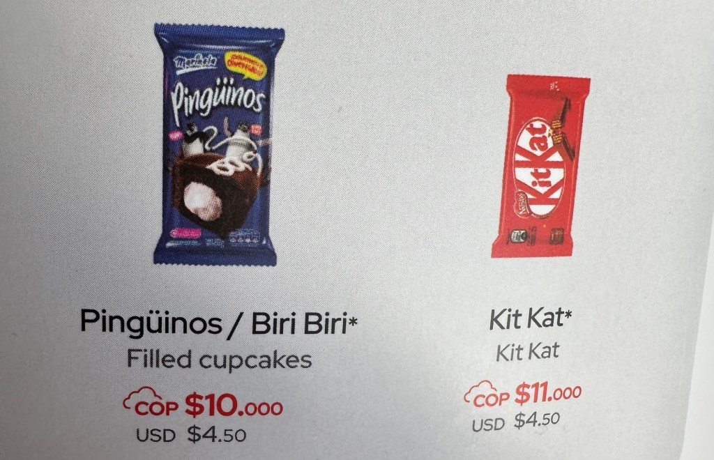 About the surprisingly “low cost” to upgrade to Avianca’s business class, I mentioned in my last post? After having experienced it, I’d say “fairly priced” is a more accurate description. Think economy, but with bigger, more comfy seats in the first three rows of the plane. Had I known the food was going to be so bad, I would have packed more than a bag of cashews and chocolate. But look at what you could choose to buy if you were flying in economy. Hostess cupcakes have been revived and given a new name!