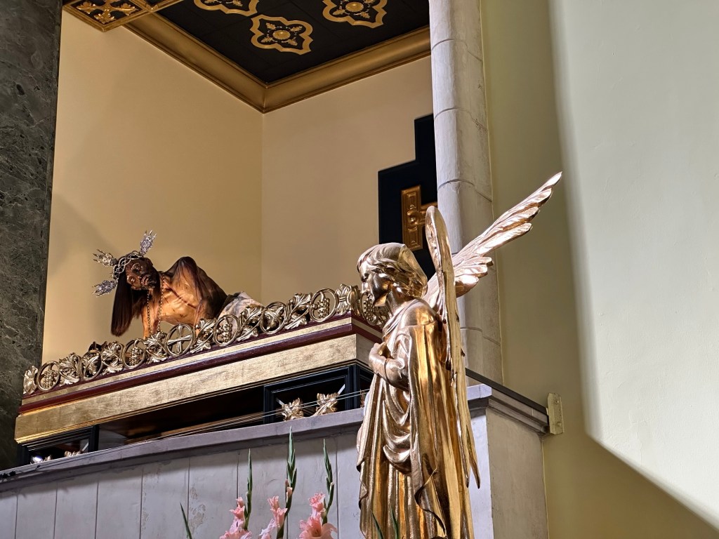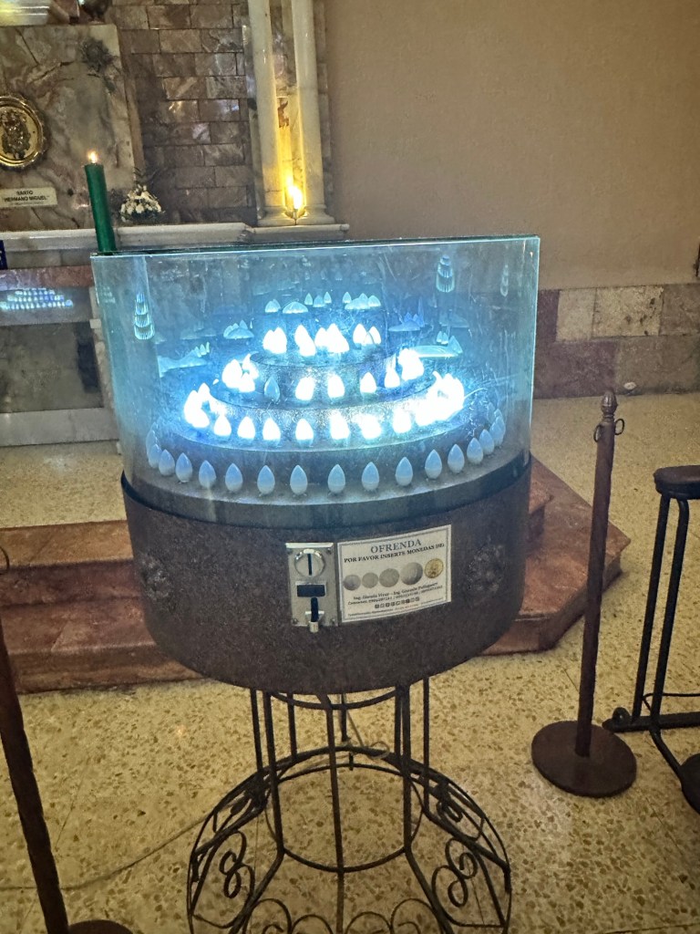 The LAST unique aspect of the church that I noticed was the “miracle area”, where people thanked “El Señor” for granting their wishes by buying a plaque. Notice the one from Luis Fernando Rendón thanking El Señor for making it possible for him to move to New York and for giving him health and strength to care for his family. It’s the gold one in the photo below.