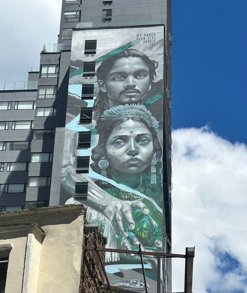 I had no idea that Bogotá has 6000 kilometers of “legal” street art, with another 1000 of “illegal” (unapproved). The tour was conducted by an artist who showed us one of his works. It depicts a creation myth. I don’t remember ALL of the story, but here’s the gist.