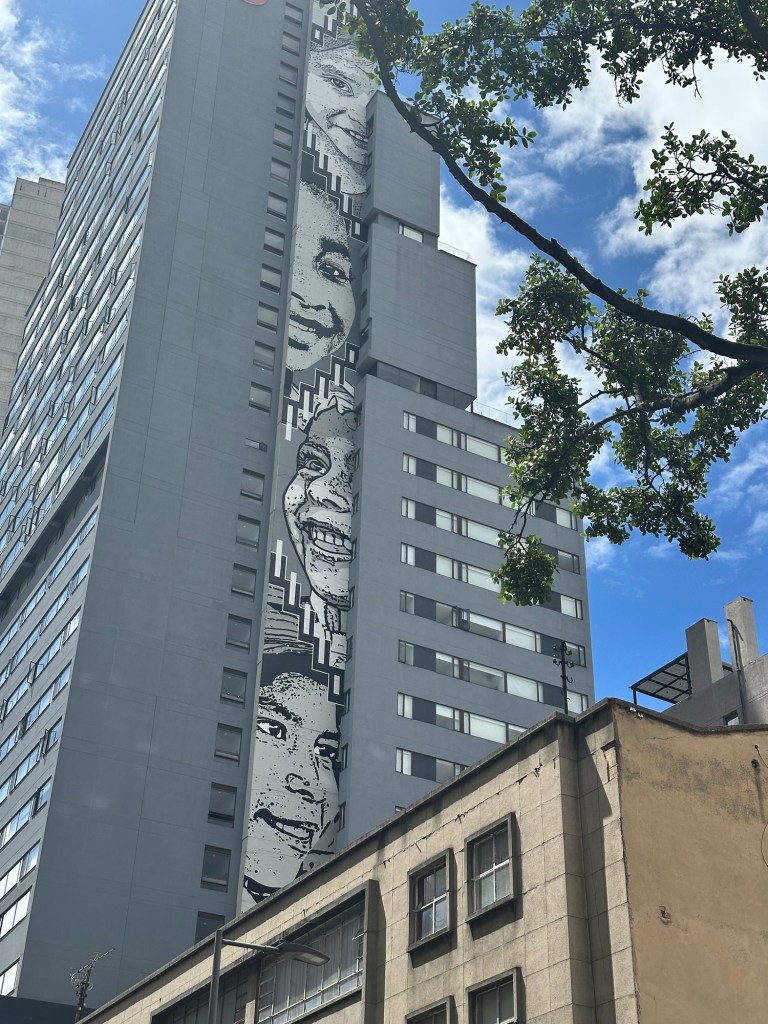 There was a whole lot more art, and MUCH more interesting narrative, but this post is getting rather long. Our next to the last stop was on a bridge, where our artist guide took this photo. The tall structure in the background is significant because it is the highest building in Colombia, completely empty, because it is tilting, like the tower in Pisa. It is also significant because a graffiti artist has placed his “tag” on the very top of the building. And if you want to know more about the interaction among graffiti, music, and common words in our culture, you’ll just have to take the tour.