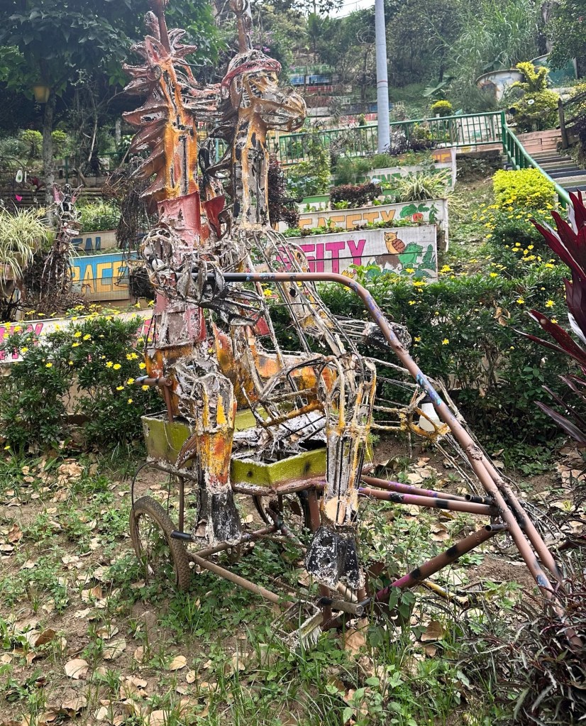 Look at the whimsical creatures they made from collected materials they transformed into sculptures. I was awed by their creativity and artistic ability. The photo below doesn’t do justice to the magnificence of the two giraffes on a bicycle. Just looking at it made me smile.