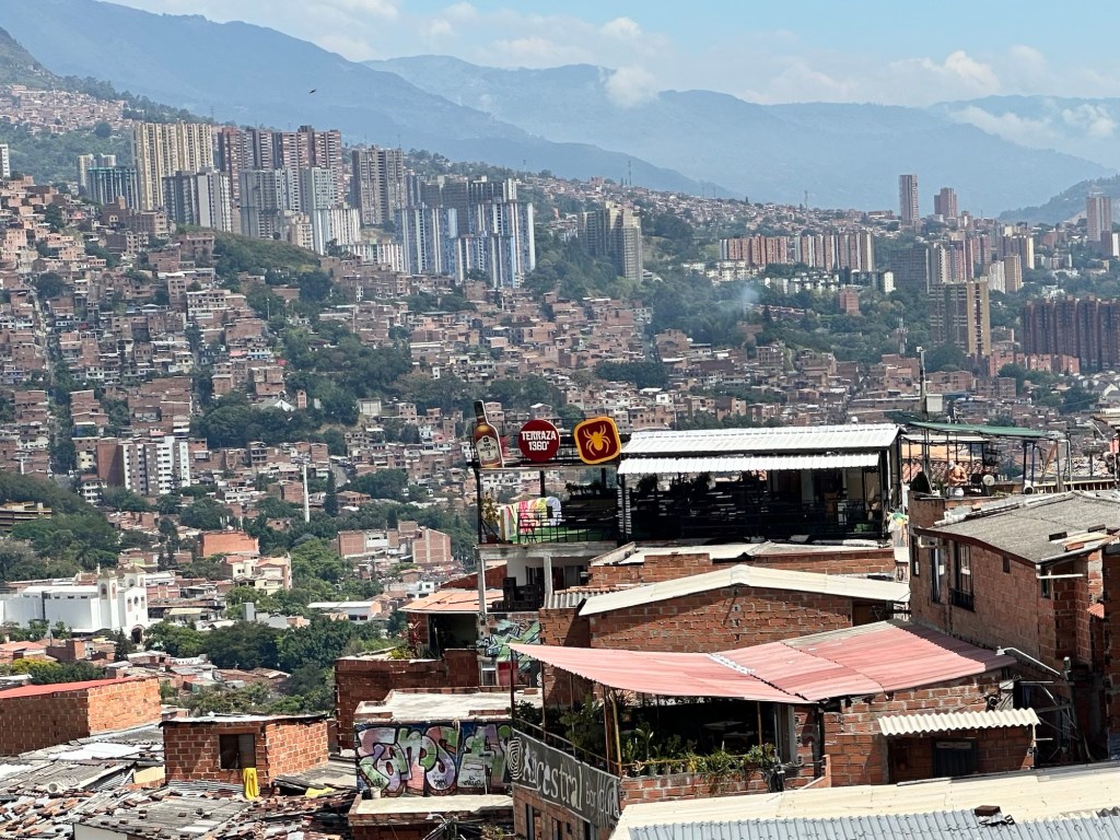 The red roof on the lower right is the cafe. Photo taken from comuna 13 escalator.