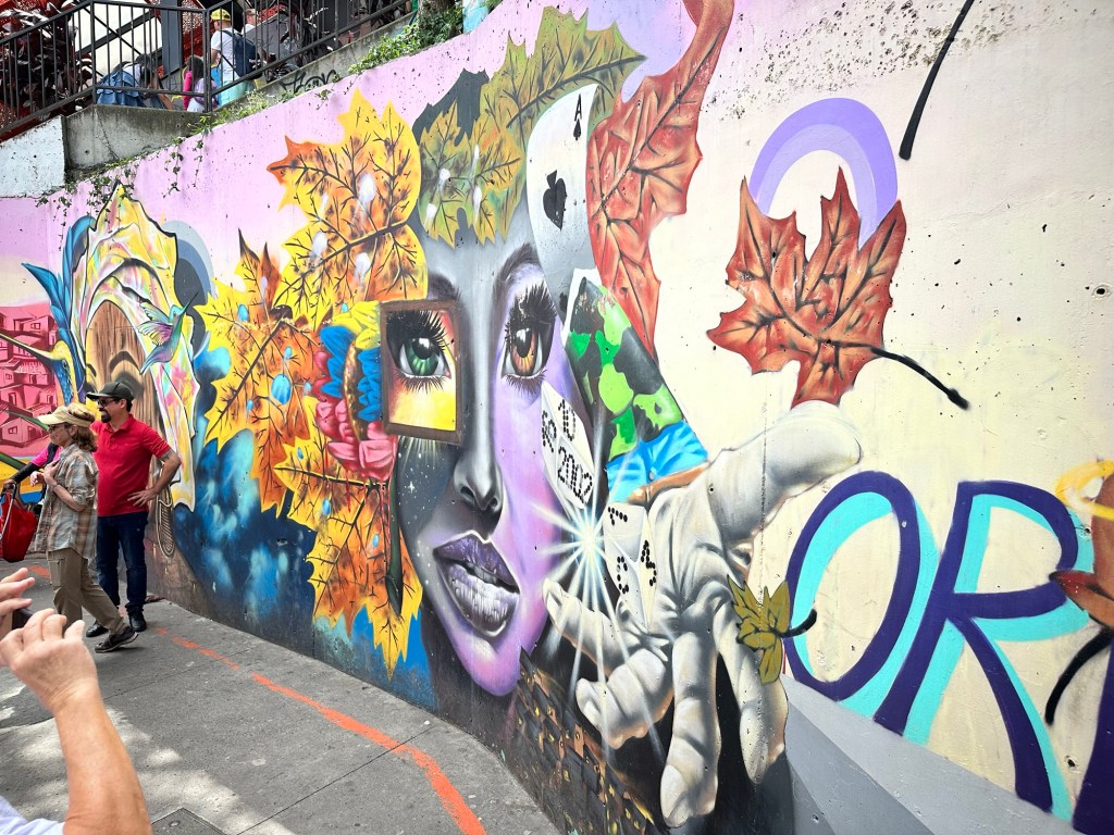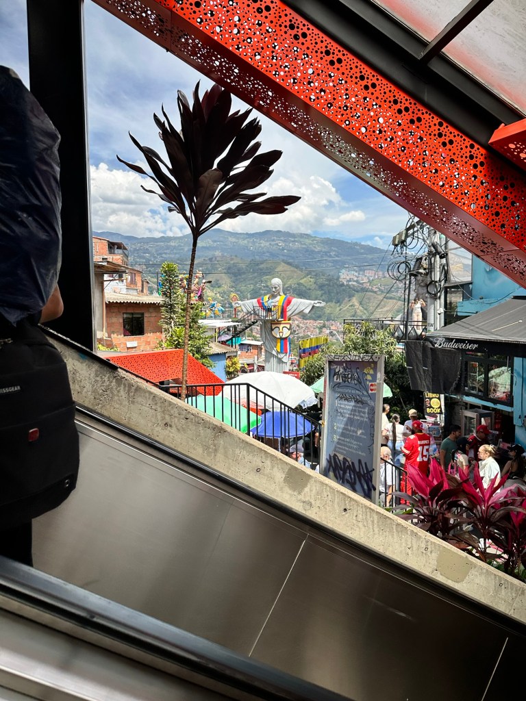 What probably helped Medellín to win the contest were the external escalators. Has anyone seen escalators outside of a building before? I sure hadn’t until I watched the 2024 amazing race episode. On the show, it looked like there was only one escalator. Nope. There are countless escalators, so described because I forgot to count them. Covering the escalators are solar panels which provide protection from the elements and produce the energy to run the escalators.
