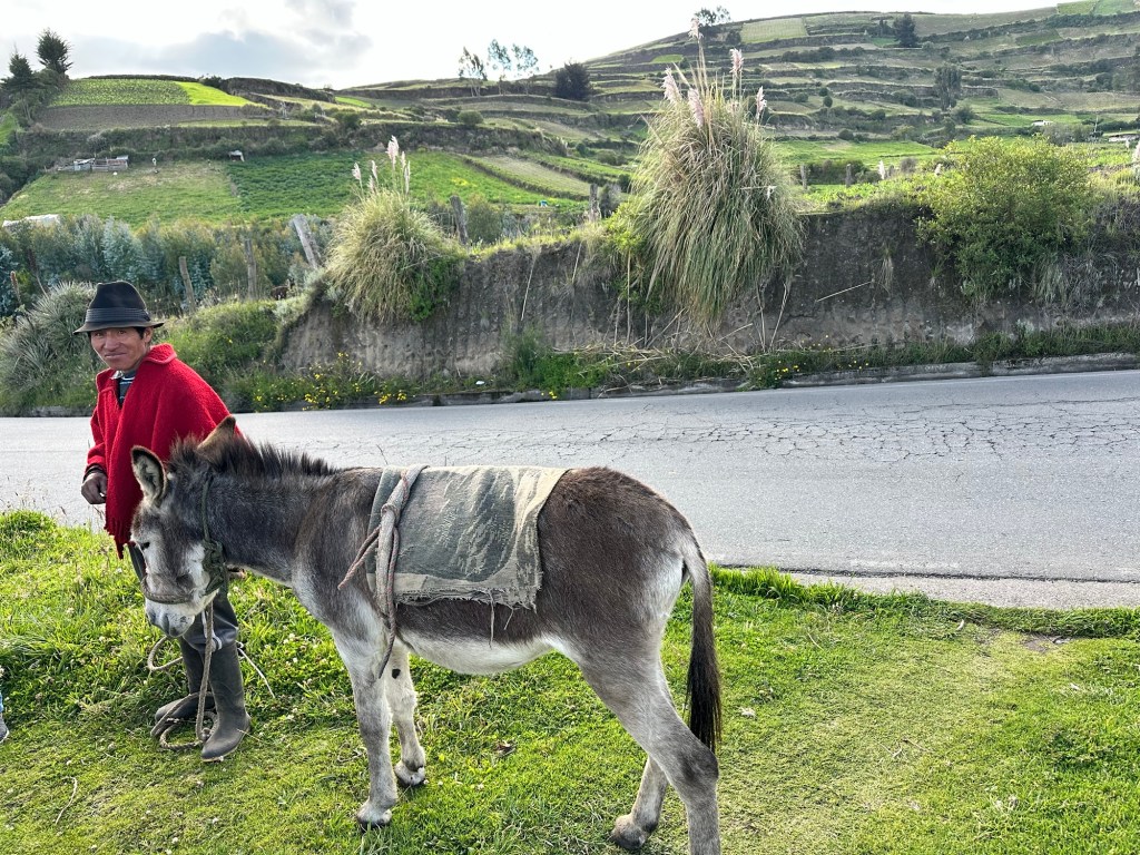 Take another look at the photo of Chimborazo. That’s where this man and his donkey climb twice a week to carve huge blocks of ice, which they carry down the mountain and sell to businesses in nearby Riobamba. When we were there, the volcano was hidden by the clouds.