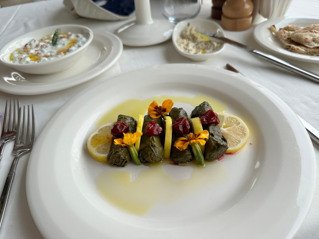 The lunch at Matbah was WONDERFUL! I opted for an appetizer (grape leaves and sour cherries) and the yogurt and cucumber salad. The complimentary baba ganoush, warm pita bread and pomegranate juice were an unexpected treat. I can fully understand how this place got its Michelin rating.