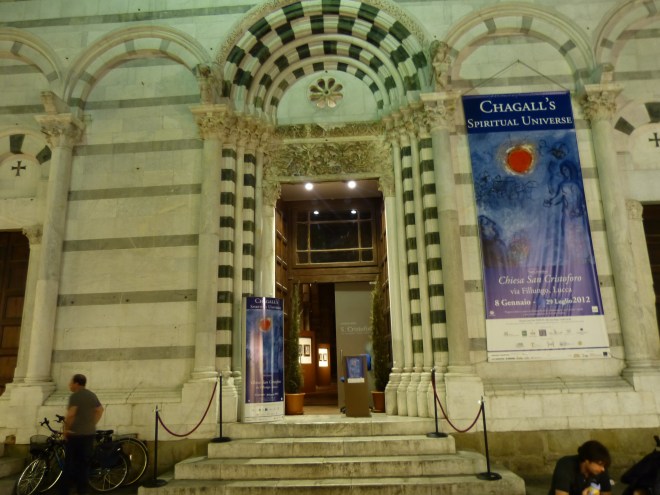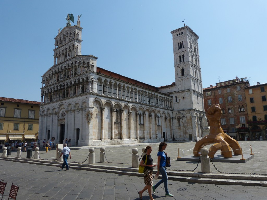That brown fist on the right was not a church decoration. It was part of a citywide art exhibit. If it hadn’t taken me three months to write this blog, I probably would remember the name of the art festival, how MANY sculptures there were–but all I can recall is that they were all totally made from paper. AND that tourists and the locals were invited to vote for their favorite. (There is another sculpture in the photo of the church of San Frediano. It looks like a bunch of space vehicles suspended from strings).