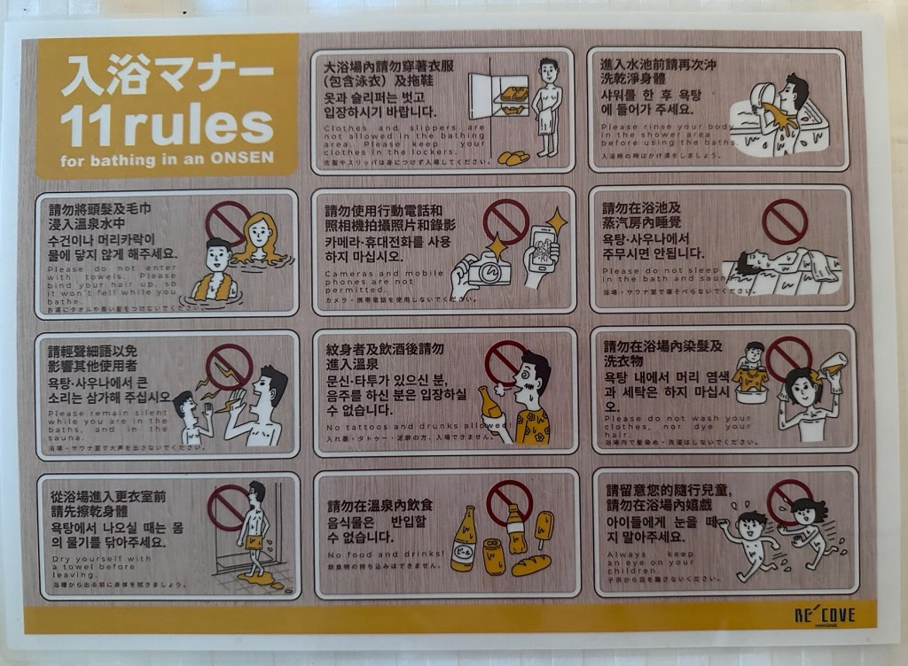 I had heard that some hotels have onsens, which are sorta like hot tubs/whirlpools except the source of water and heat is the naturally occurring hot springs. I definitely wanted to experience THAT, so I dutifully packed a bathing suit and cover up. That was totally unnecessary, because the onsens have many rules, one of which is you either go naked or you don’t go. Take a look.