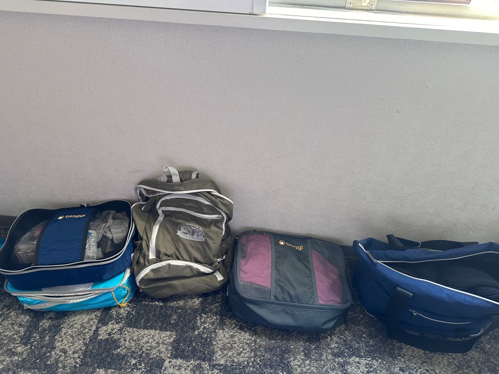 My packing cubes functioned as bureau drawers in these bureau-less and closet-less rooms. Yep, I just put them on the floor. in the narrow space between the bed and the window.
