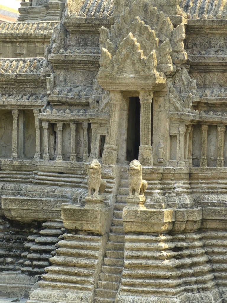 Spirit houses are very common in Thailand and Cambodia. They are usually miniatures of the actual dwelling, and filled with offerings to the gods. Can you see the little figures inside?
