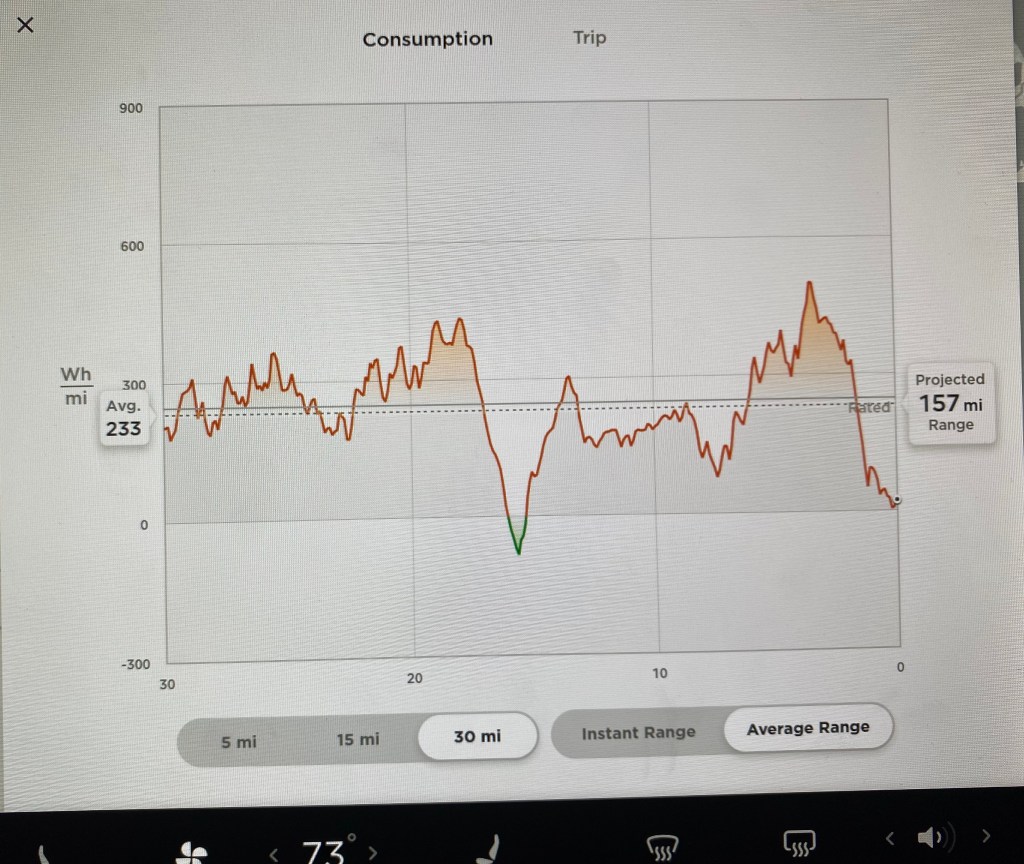 The discoveries keep coming. Here’s another. When you let the car drive itself, energy consumption improves. At least it did for me. Here’s how I could tell. The energy app shows average consumption over three different ranges. 300 watt hours per mile is the expected average, but the thick solid line in the graph below shows the expected average when the terrain (and possibly external temperature?) is taken into consideration. The dotted line shows my actual results for the past 30 miles. If it is below the solid line, I’m doing better than expected. (This is one example where being “above average” ISN’T a good thing). Notice the little green triangle? That’s when the battery was recharging itself. If I continued to drive the way I had for the past 30 miles, I would have sufficient energy to go another 157 miles. What’s puzzling is when you add the averages (actual and projected) you come up with 390 miles, which is far greater than the EPA range of 322.