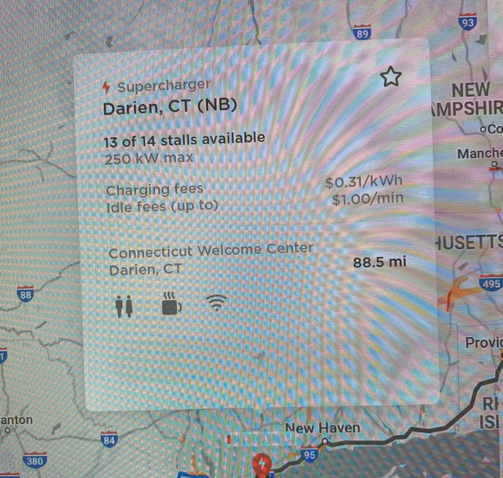 When I used the Tesla trip planning app, it assumed that I would be starting on the trip at the current charge level. I had never charged to 100% before (the physicists know why, but WE don’t need to get into the technical details here) so the app led me to believe that I wouldn’t be able to make the 260 mile trip without stopping to recharge. Wrong. If I chose to do so, I discovered I could have easily made it the entire way, with at least 20% battery to spare.