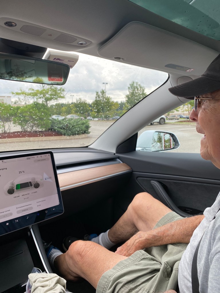 Sad to say, I discovered the battery has a much longer range than my kidneys. MY need to stop occurred WAY before I needed to charge. Here’s another thing: for a reason that is obvious to the physicists and engineers, (but a mystery to me) a battery charges faster when it is closer to empty than when it is closer to full, so that’s something else to factor when planning your stops. So many things to consider. I’m proud to reveal that I did somewhat better on the return trip mastering the car/body connection. One unanticipated snag was the charging station in Madison was “temporarily out of service”, disrupting my plan to charge while visiting with a friend. Fortunately, I knew that BEFORE I headed back, so was able to reconfigure my stops. All these “discoveries” will make my next trip stops so much easier to plan.